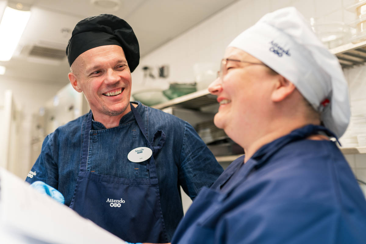 Attendo-kodeissa työskentelee noin 400 keittiöalan ammattilaista tekemässä ruokaa. Meillä on noin 160 valmistuskeittiötä. Suunnittelemme ruokalistat ja reseptiikan itse. Itse tekeminen tarkoittaa, että pystymme varmistamaan laadun ja tarjoamaan maukasta kotiruokaa asukkaillemme aamiaisesta iltapalaan. Käytämme aterioissamme pääosin kotimaisia raaka-aineita.